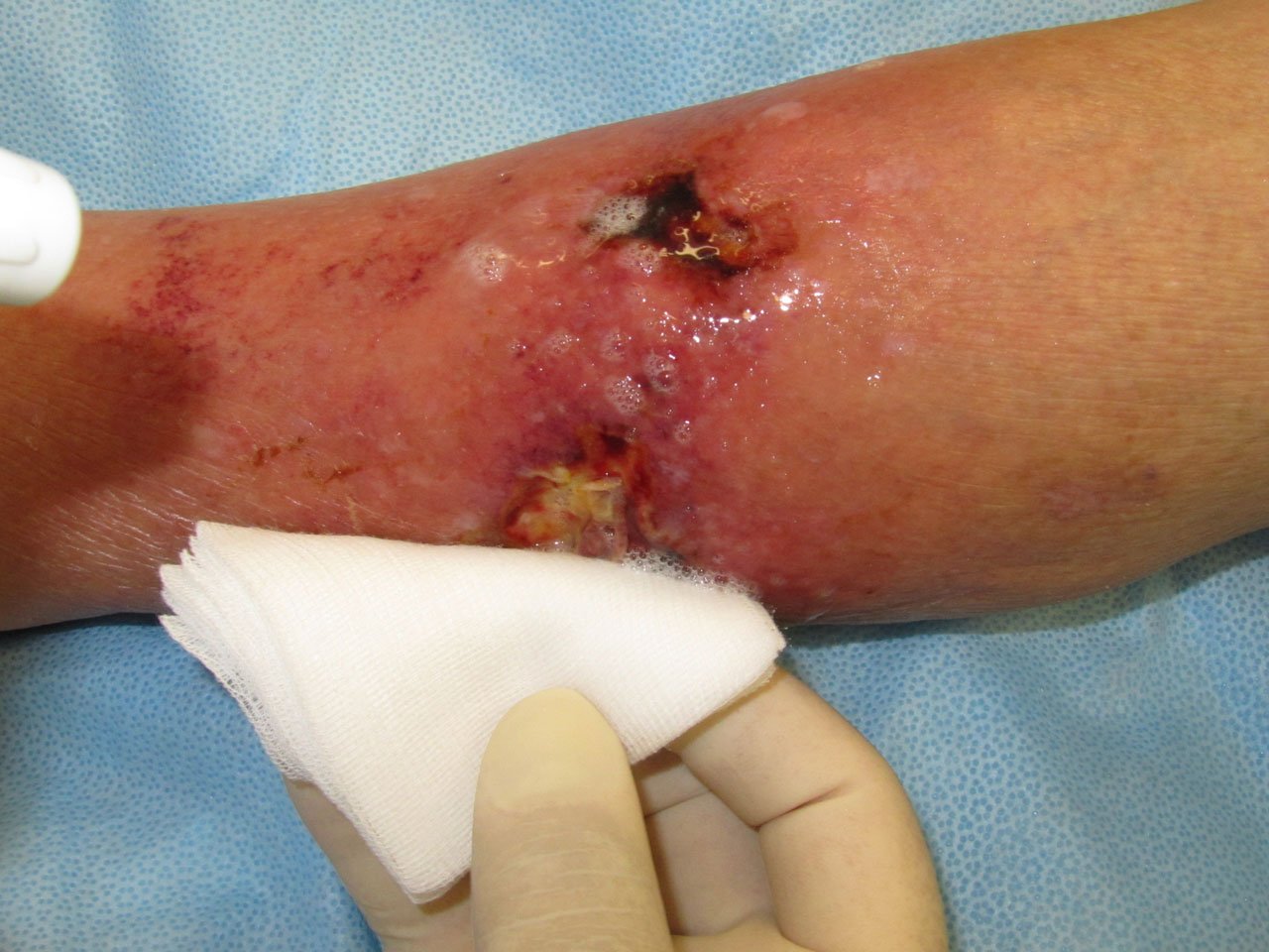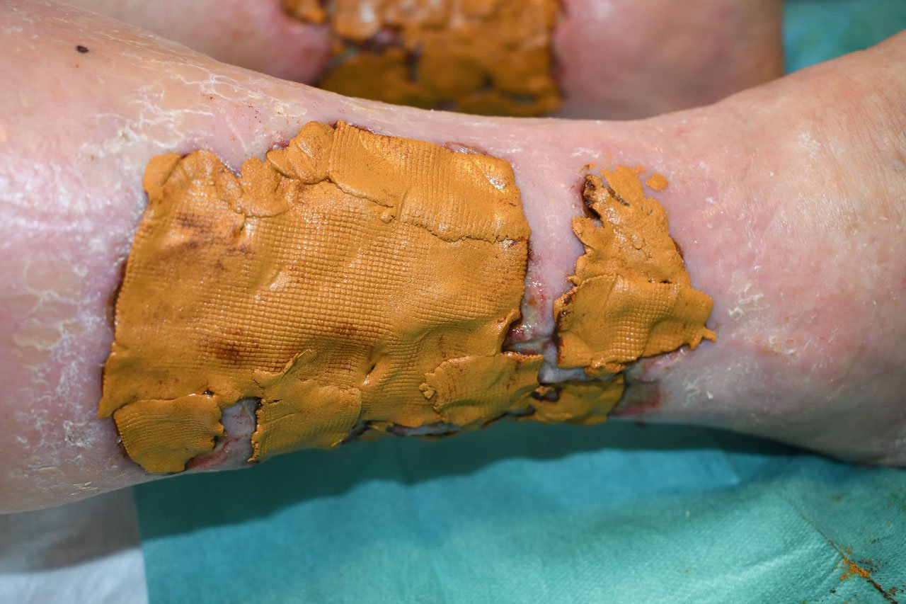 Bild 1: Infizierte Wunde am Unterschenkel nach Hauttransplantation