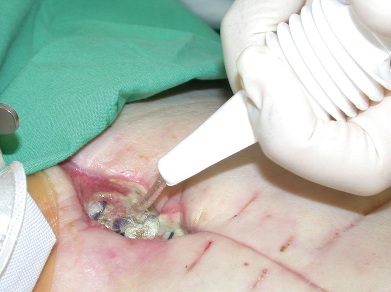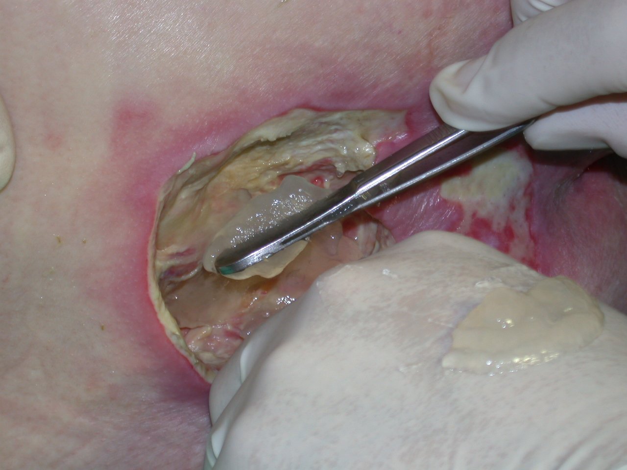 Bild 1: Bereits autolytisch behandelte Nekrose an der Wade