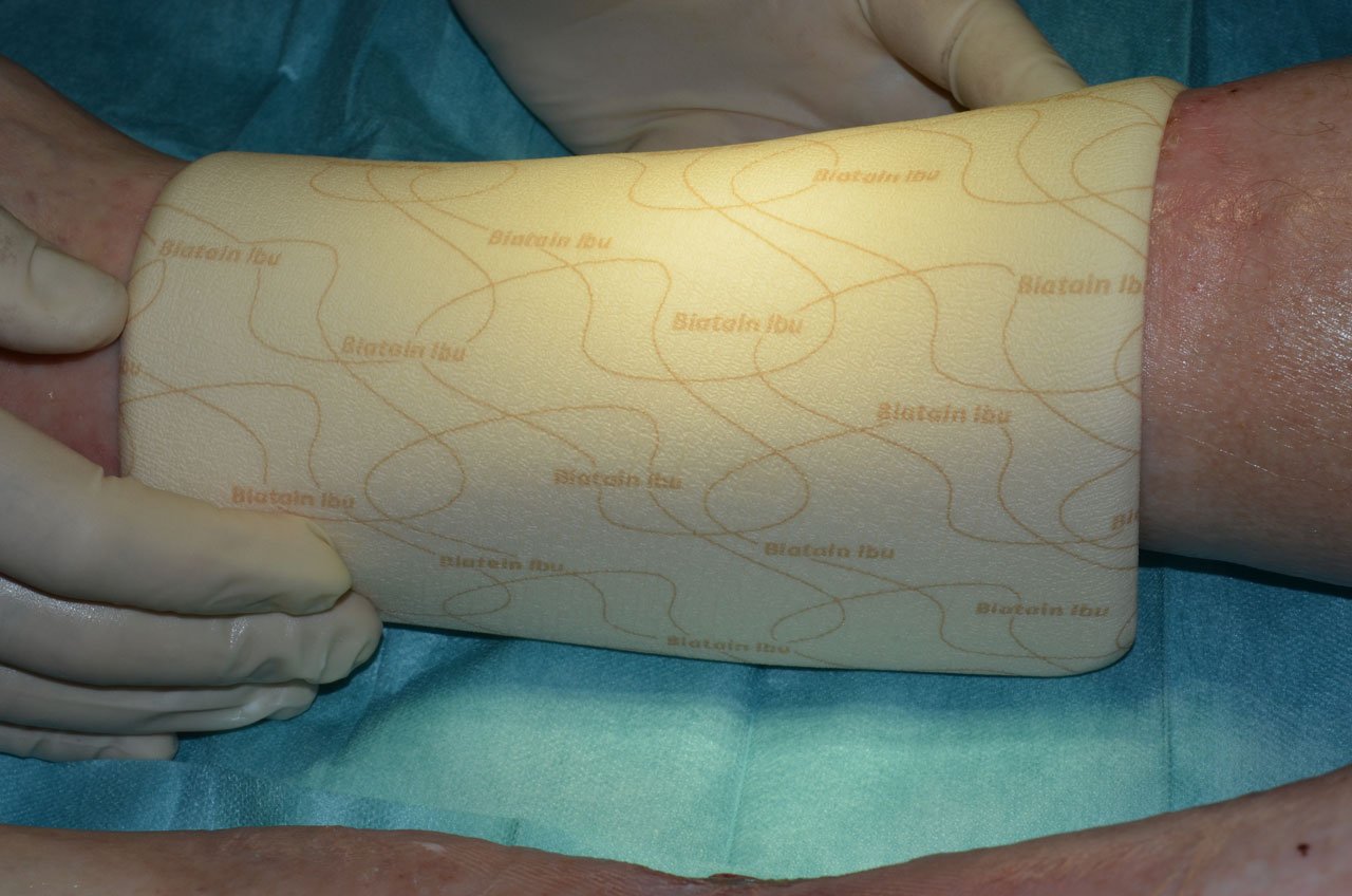 besitzt die Vorzüge des Biatain Schaumverbandes und wirkt aufgrund eines Ibuprofen-Zusatzes schmerzmildernd. Das freigesetzte Ibuprofen wirkt nur lokal in der Wunde. Je nach Exsudatfreisetzung kann der Verband bis zu 7 Tage belassen werden.
