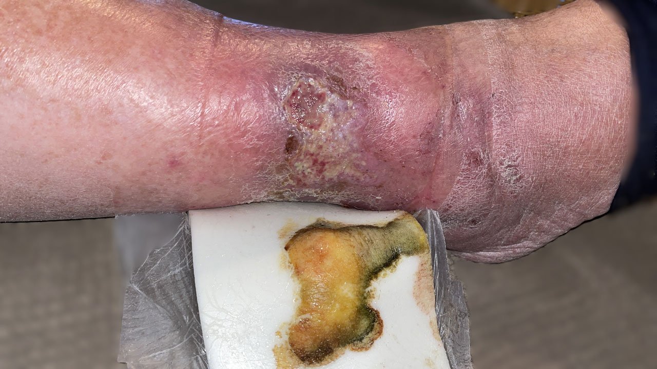 Bild 1: Stagnierendes Ulcus cruris venosum über dem Außenknöchel.