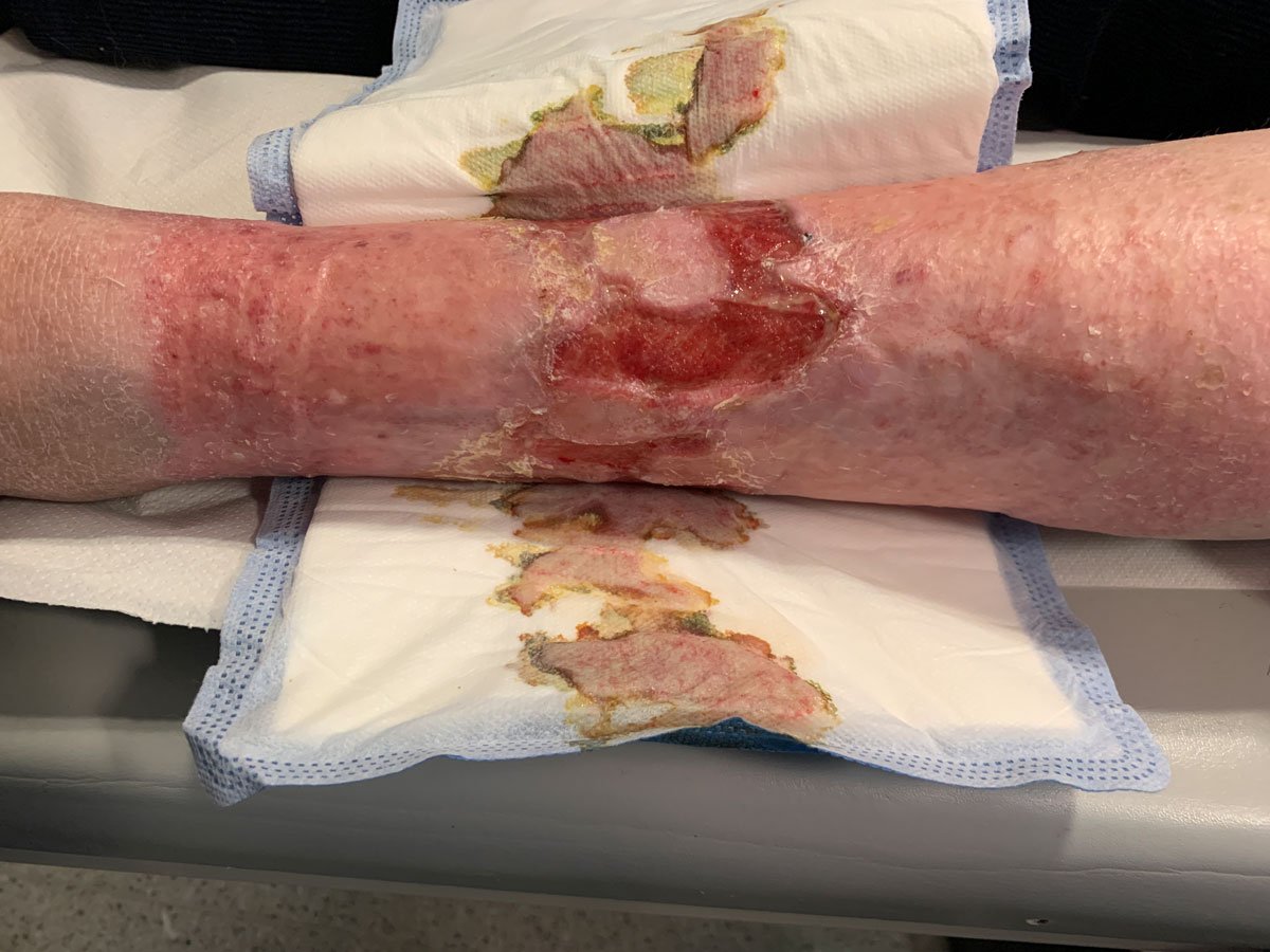 Bild 1: Zustand nach Kompartmentspaltung am Unterschenkel, hohe Exsudation