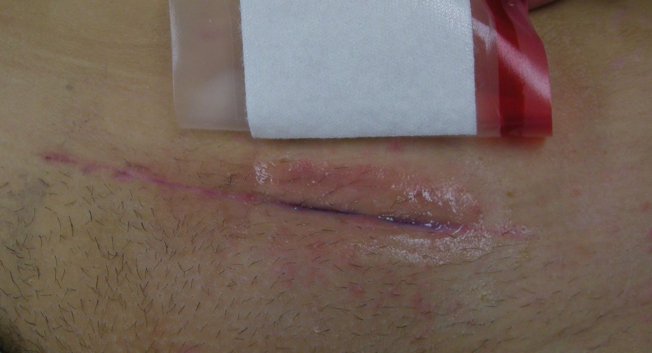 Bild 1: Traumatische Wunde an der Schläfe nach Erstversorgung durch Naht